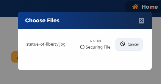 4) After selecting files the upload progress will be displayed, as in the below example. Please note that this process can take many minutes if the files are large, as the files are secured and sent onto our offsite storage.
