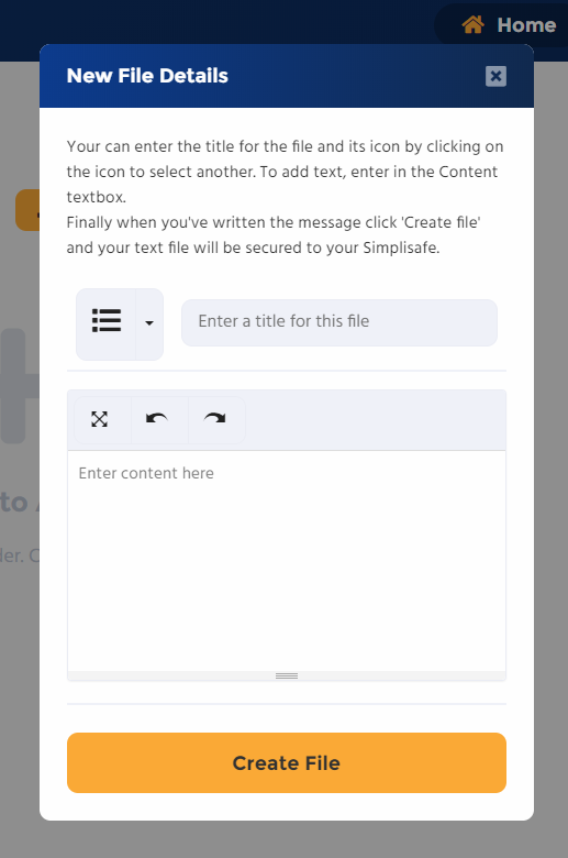 3) When on the ‘Choose files’ popup, click the pink button on the right ‘Create a new text file’. This will bring up a window for you to enter the file details as shown below: