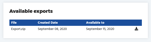 You may have exports already available to download. These will appear under the ‘Available exports‘ section and will give you a ‘creation‘ and ‘available to‘ date. Our system will automatically delete the export when it expires, and your next available export will be available the day after the current export expires.